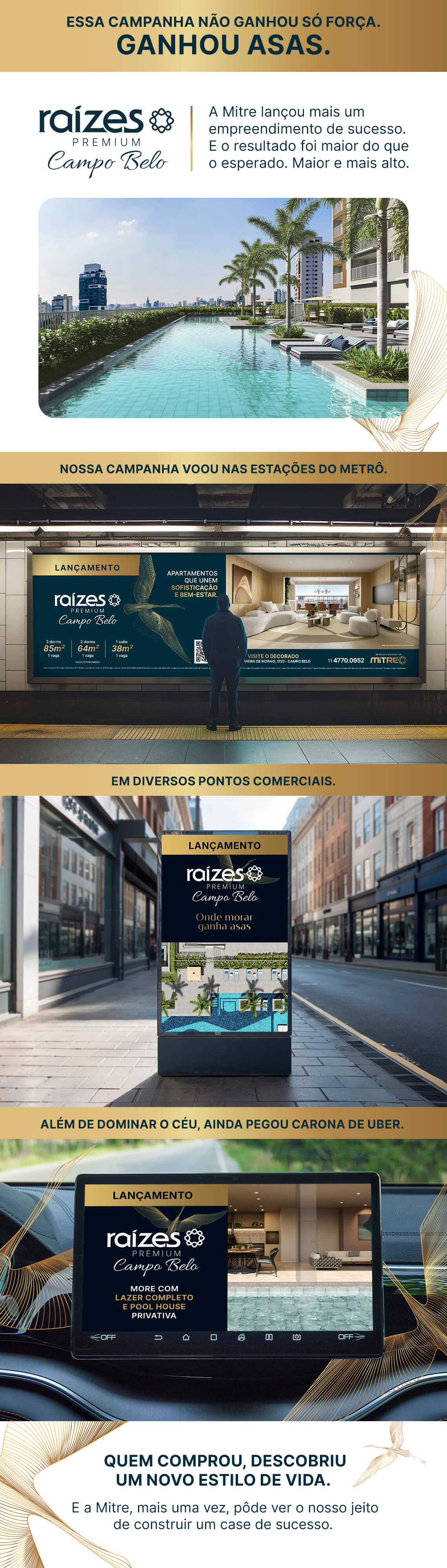 Para apresentar o Raízes Premium Campo Belo ao mercado, a Brancozulu desenvolveu uma campanha guiada pelo conceito “Onde morar ganha asas”, traduzindo mobilidade, qualidade de vida e tempo como novos luxos urbanos. A estratégia ganhou escala em um plano de mídia que combinou, rádio, out of home, digital, vídeos em edifícios comerciais e residenciais, entre outros. Um lançamento pensado para impactar diferentes momentos da jornada do público-alvo e fazer a marca decolar desde o primeiro contato.
